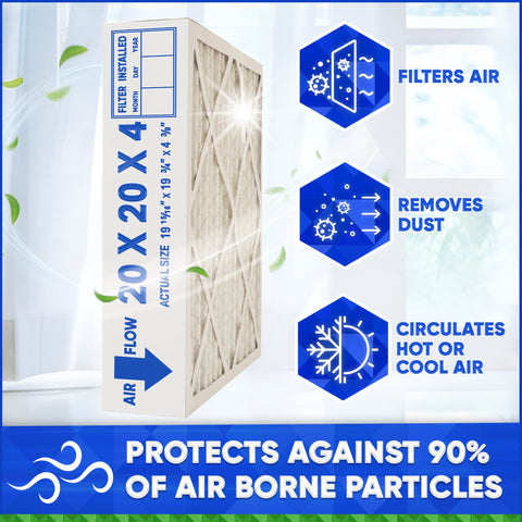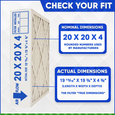 Honeywell 20x20x4 Furnace Filter Model # FC100A1011 MERV 8. Actual Size 19 15/16" x 19 3/4" x 4 3/8." Case of 3